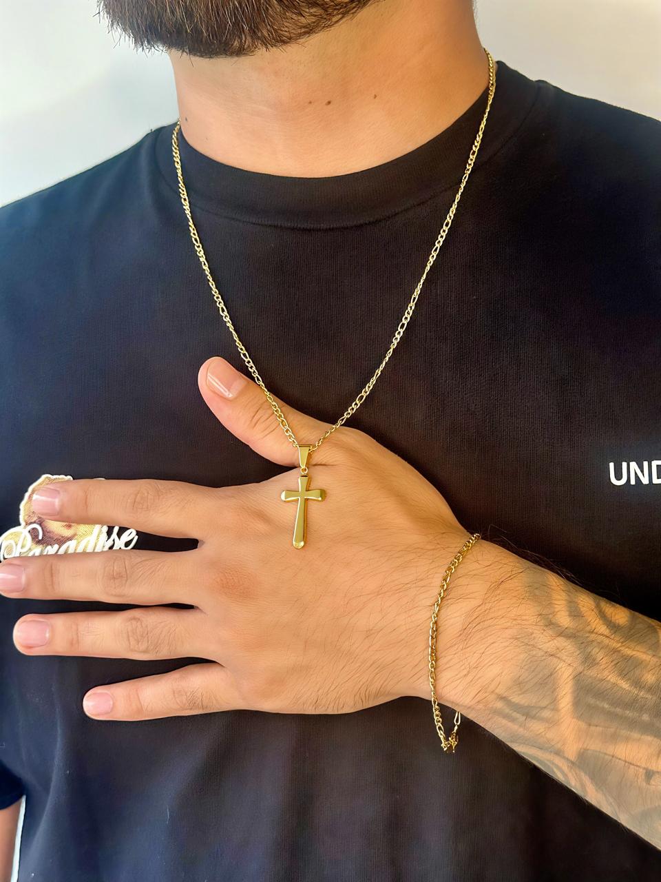 Este elegante combo incluye una cadena tipo Cartier en oro laminado 18k, acompañada de una pulsera a juego y un dije de cruz, perfecto para quienes buscan estilo, presencia y un toque de fe en su look diario.